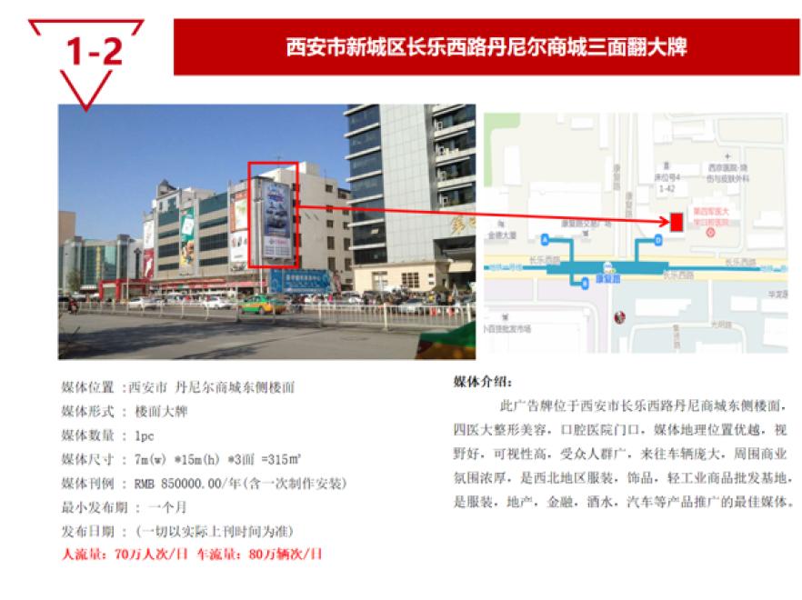 此广告牌位于西安市长乐西路丹尼商城东侧楼面,四医大整形美容,口腔医院门口,媒体地理位置优越,视野好,可视性高,受众人群广,来往车辆庞大,周围商业氛围浓厚,是西北地区服装,饰品,轻工业商品批发基地,是服装,地产,金融,酒水,汽车等产品推广的最佳媒体。