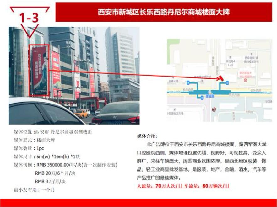 此广告牌位于西安市长乐西路丹尼商城楼面,地理位置优越,视野好,可视性高,受众人群广,来往车辆庞大,周围商业氛围浓厚,是西北地区服装,饰品,轻工业商品批发基地,是服装,地产,金融,酒水,汽车等产品推广的最佳媒体。