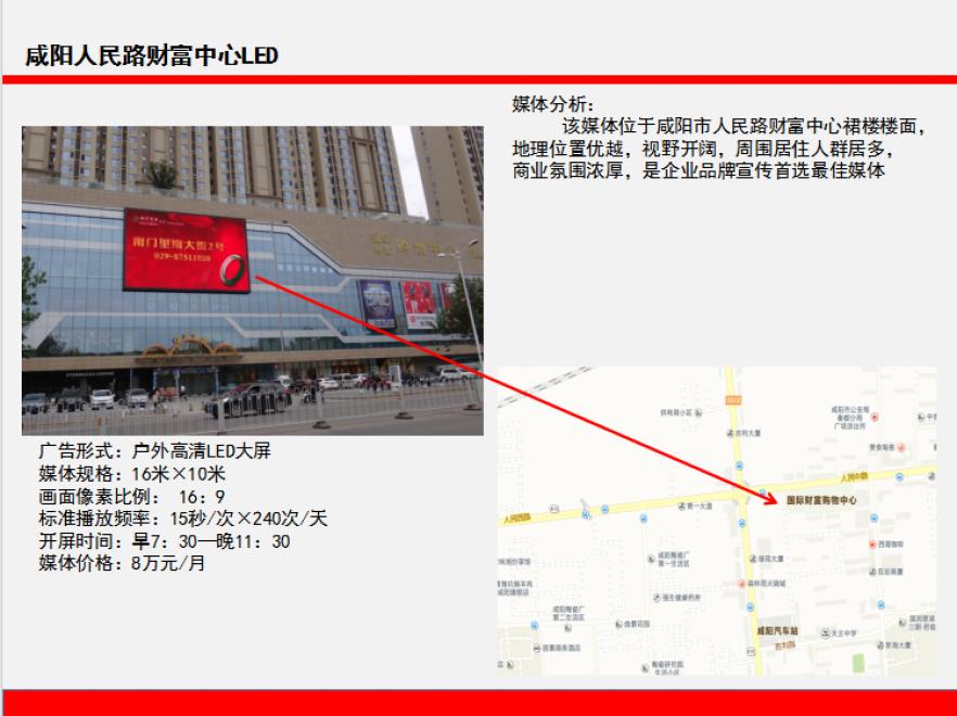 该媒体位于咸阳市人民路财富国际商城楼面,地理位置优越,视野开阔,人民路是咸阳市区的主要干道,周围居住人群密集,商业氛围浓厚,商城里面入住了各种品牌,餐饮、娱乐、购物一体的商业综合体、人车流量巨大,是企业品牌宣传首选最佳媒体。