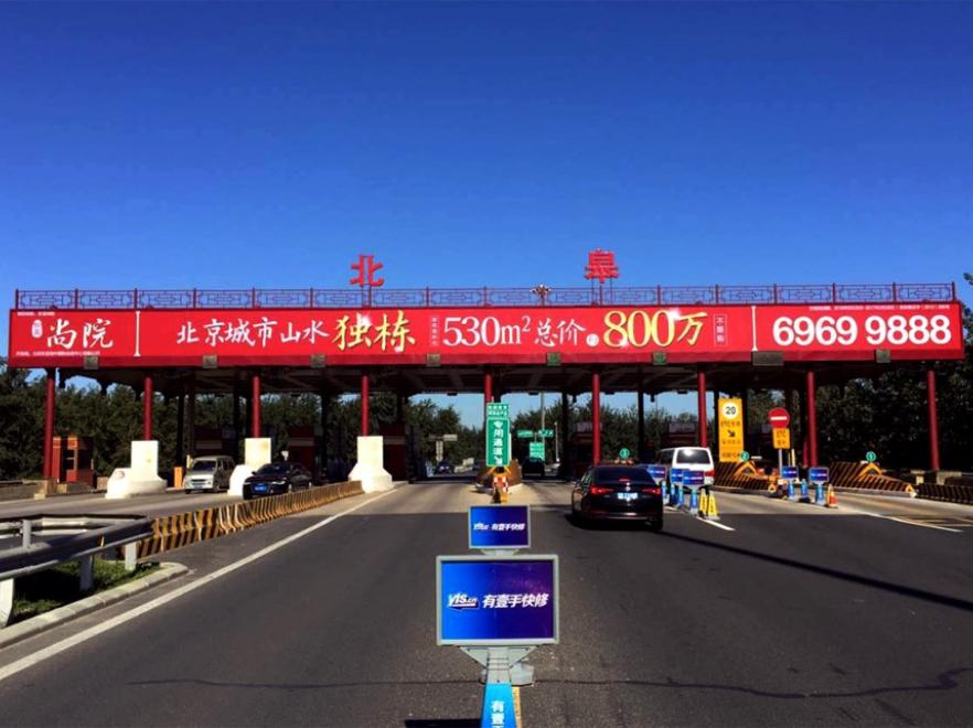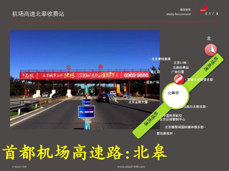 媒体简介 > ● 机场高速双向效果 ● 媒体距主路非常近,冲击力强 ● 因位处机场高速出口,车流量大 拥堵严重 北皋站是机场高速五环外第一个收费站,是机场高速与京密路的交汇连接点。京密路与机场高速路平行,京密路可以视作机场高速的辅路。