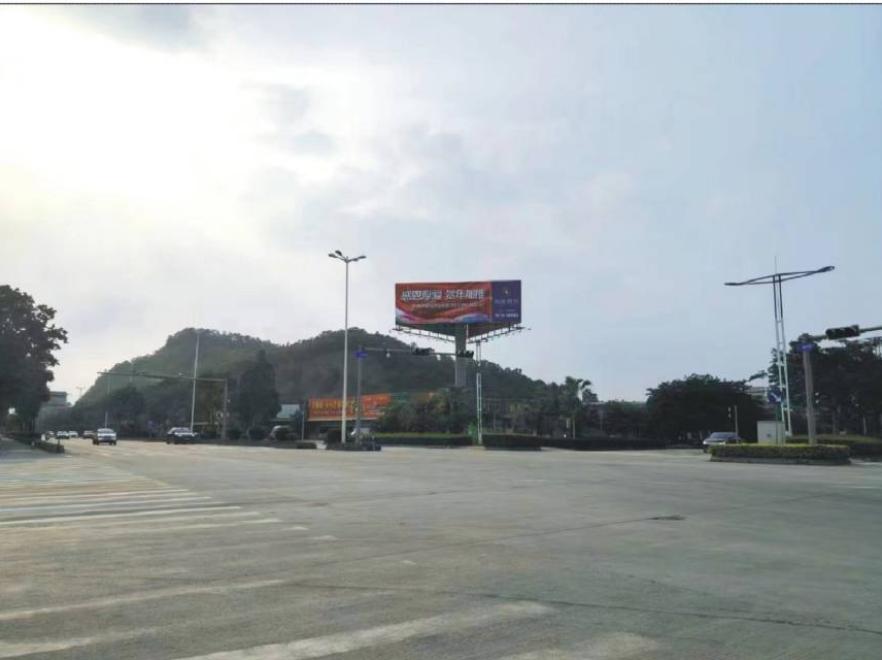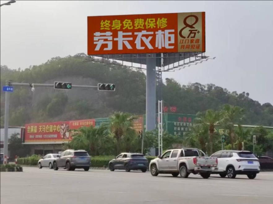 该立柱广告牌位于江门市新会区启超大道与银湖大道交界处,启超大道北连新会大道,南连银湖大道,是连贯会城旧城区和南湖新城区的主要道路,而银湖大道是连接今古洲开发区、珠海、中山等城市的重要马路。启超大道沿路上有万达广场、新汇悦广场及多个商业住宅群体,银湖大道沿路上有新会区人民政府、陈皮村、小鸟天堂、梁启超故居等,每日来往于该两条马路的车流量较大。广告牌面面对红绿灯,视野开阔,视觉冲击力强,广告效果显著。无可否认,该广告牌资源必定是企业、商家做宣传树形象的必争位置。