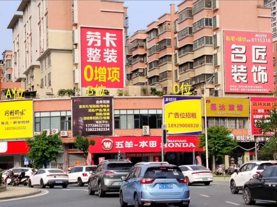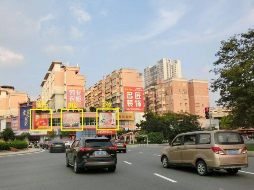 该广告牌位位于新会区会城交通最繁忙的路段之一冈州大道东与侨兴北路交界处,该路段每日的车流量和人流量都非常大,同时牌面面对冈州大道及多个红绿灯处,视野开阔,视觉冲击力强,广告效果显著。无可否认,此广告位必定是企业、商家做宣传树品牌的黄金广告位置。