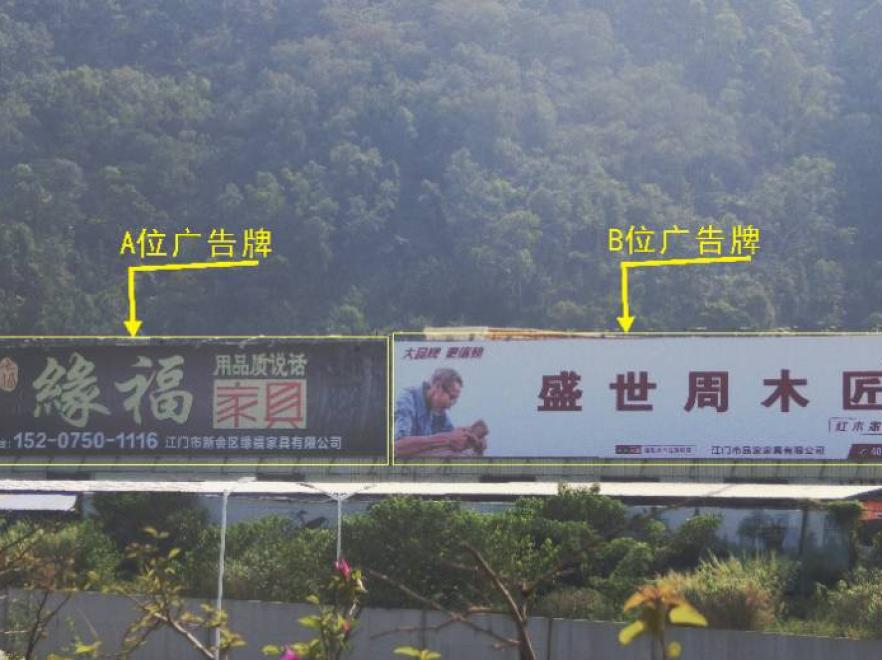 该广告牌位于江门大道与江沙路交界处,江门大道是环江门最重要的交通枢纽,连接多条道路,每日来往佛山、顺德等珠三角城市的车辆都经过该大道,而且广告牌周边及附近有滨江新城、多个汽车专卖店等。故此,广告受众率高,加上广告牌视野开阔、视觉冲击力强。无可否认,该广告牌必定是众商家树形象做宣传的必争之地。