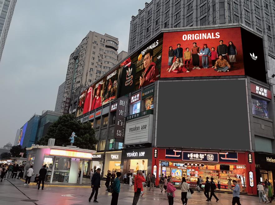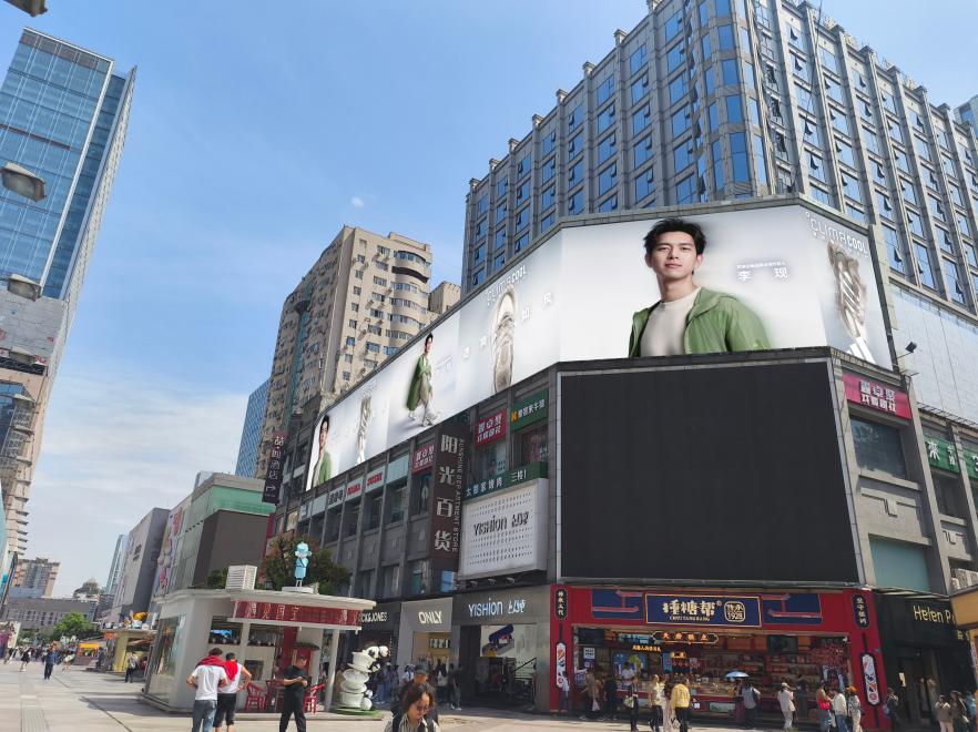 位于春熙路步行街春熙路东段1号阳光百货裙楼,中山广场东侧,人流量巨大,日均人流量大于70万次。紧邻群光广场、红星路广场、IFS、春熙路地铁站、太古里。正对人流,强势冲击,高度在三层楼上方,无任何遮挡。
